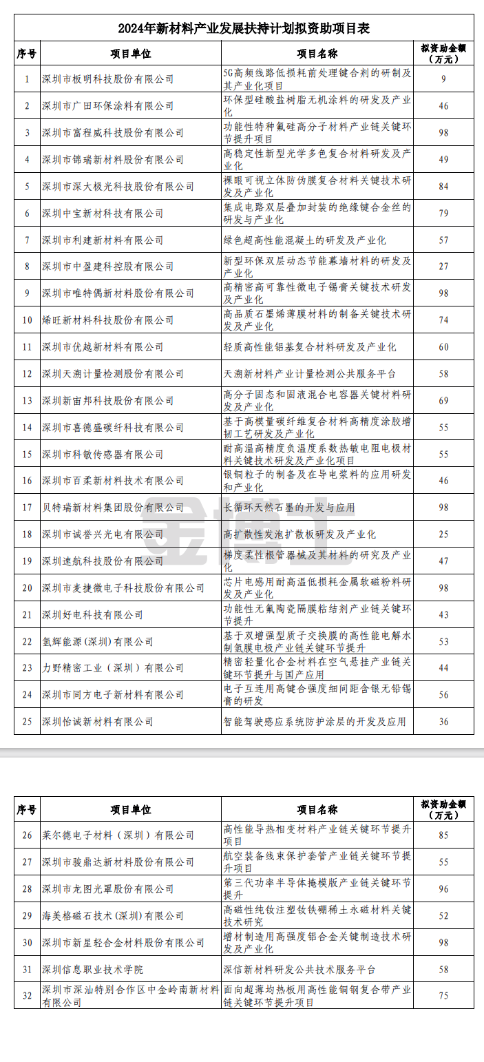 2024年深圳市新材料產業發展扶持計劃擬資助項目公示的通知